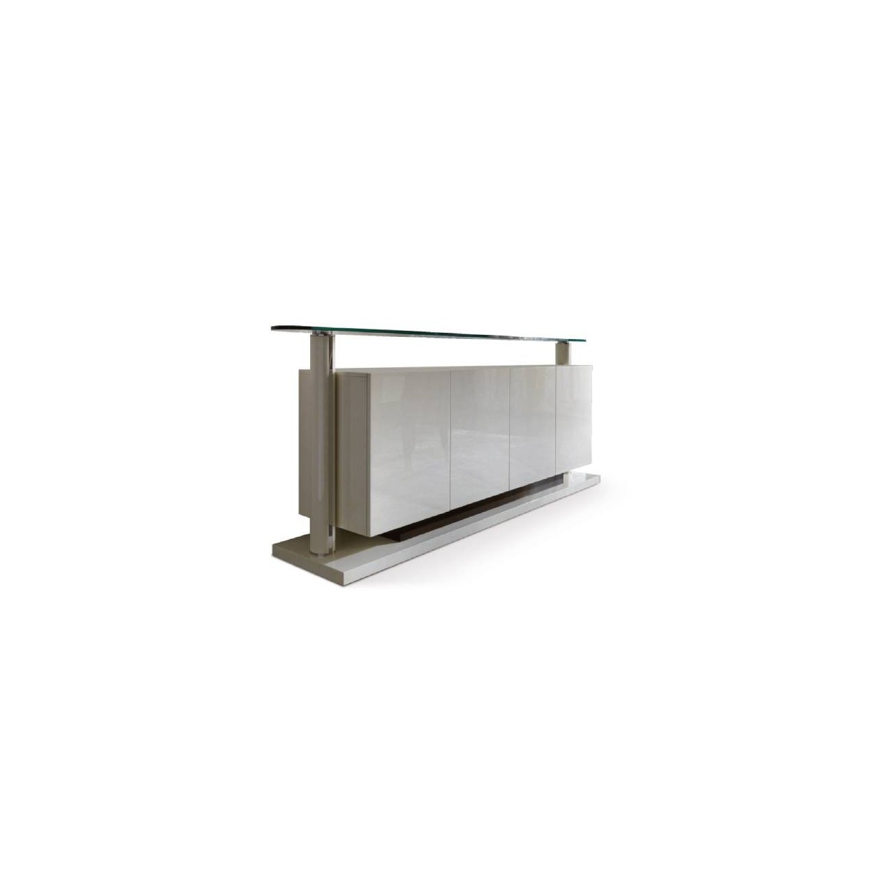 La credenza della collezione Ouverture è composta da diversi elementi legati in armonia fra loro, la base rettangolare con le due colonne laterali sorreggono il blocco centrale a quattro ante, il top in vetro trasparente dona leggerezza al mobile contenitore. I dettagli in metallo cromo ne sottolineano le linee eleganti. La credenza Ouverture è disponibile in diverse finiture come da campionario.
