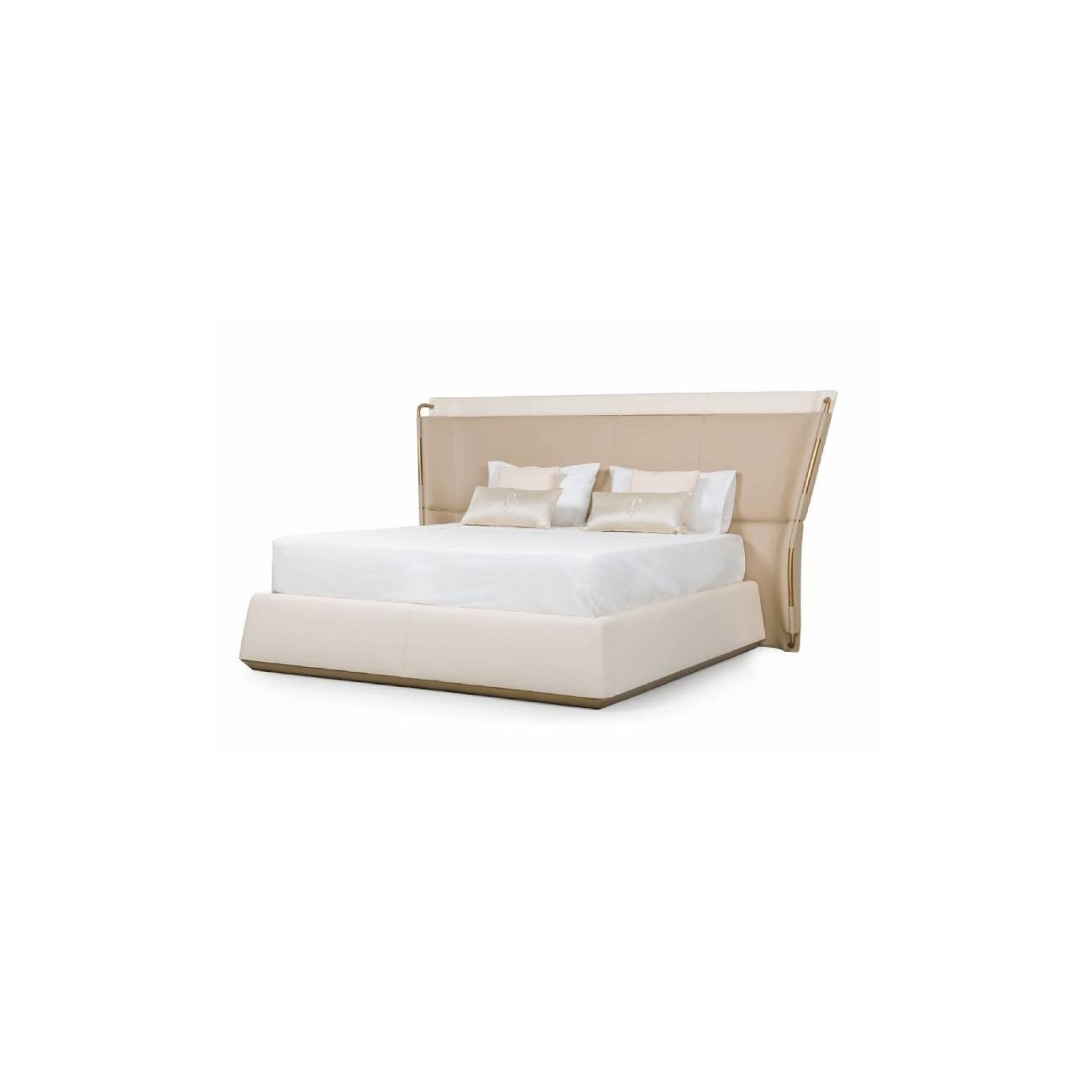 Il letto della collezione Melting Light ha una testata alta e avvolgente, con ampie fasce orizzontali. I dettagli tubolari in metallo oro ne esaltano le forme. Il letto è interamente rivestito in pelle, con la possibilità di giocare con eleganti contrasti cromatici. Il letto è disponibile nella versione king size e standard. Il letto Melting Light è disponibile in diversi rivestimenti come da campionario.