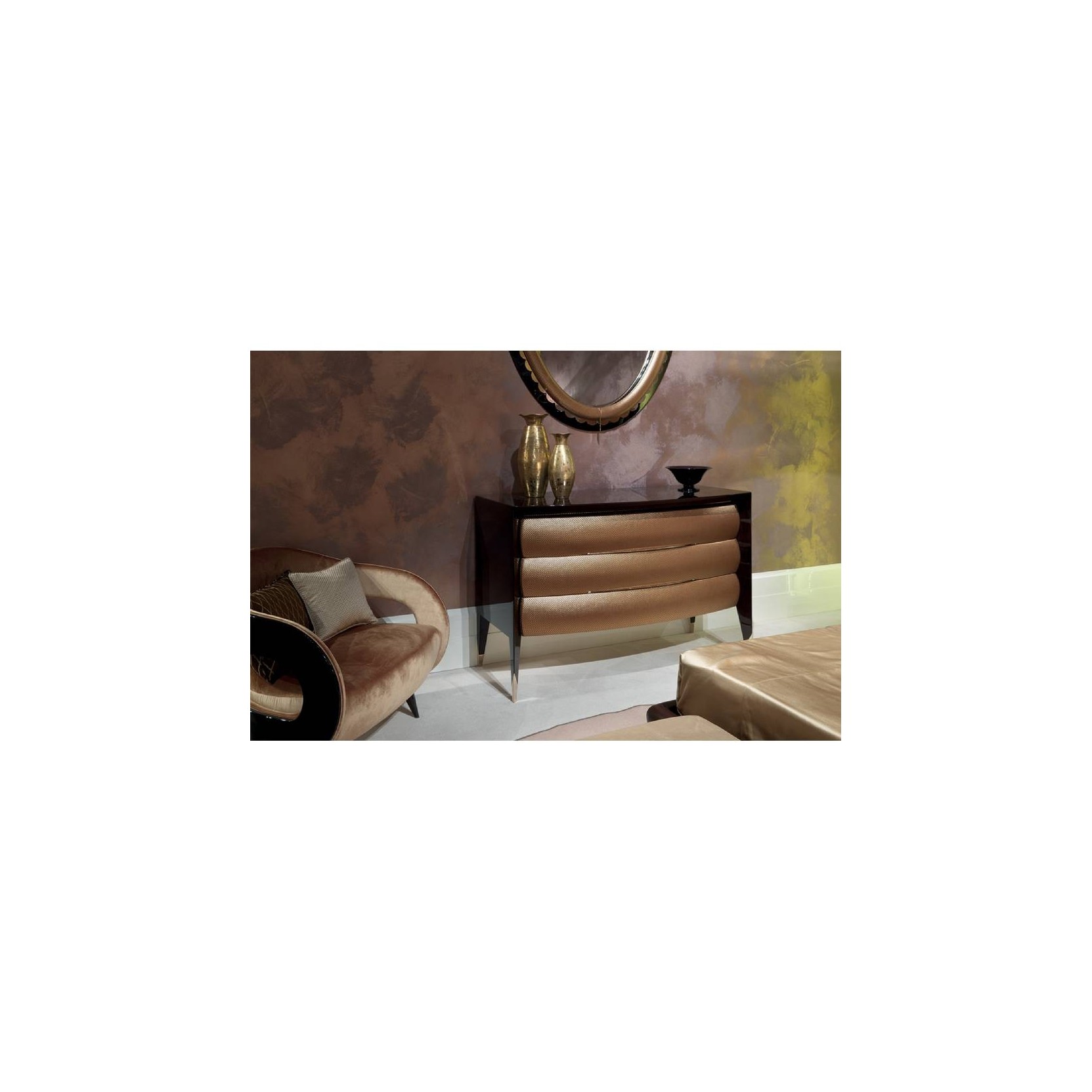 Il comò della collezione Orion è un arredo dalle linee pulite e contemporanee, la struttura è realizzata in legno laccato lucido, è dotato di tre cassetti bombati rivestiti in pelle che risaltano inseriti nella struttura in legno. I puntali in metallo oro si innestano elegantemente sulle gambe. Il comò Orion è disponibile in diverse finiture come da campionario.Spedizione 5-6 settimane lavorative