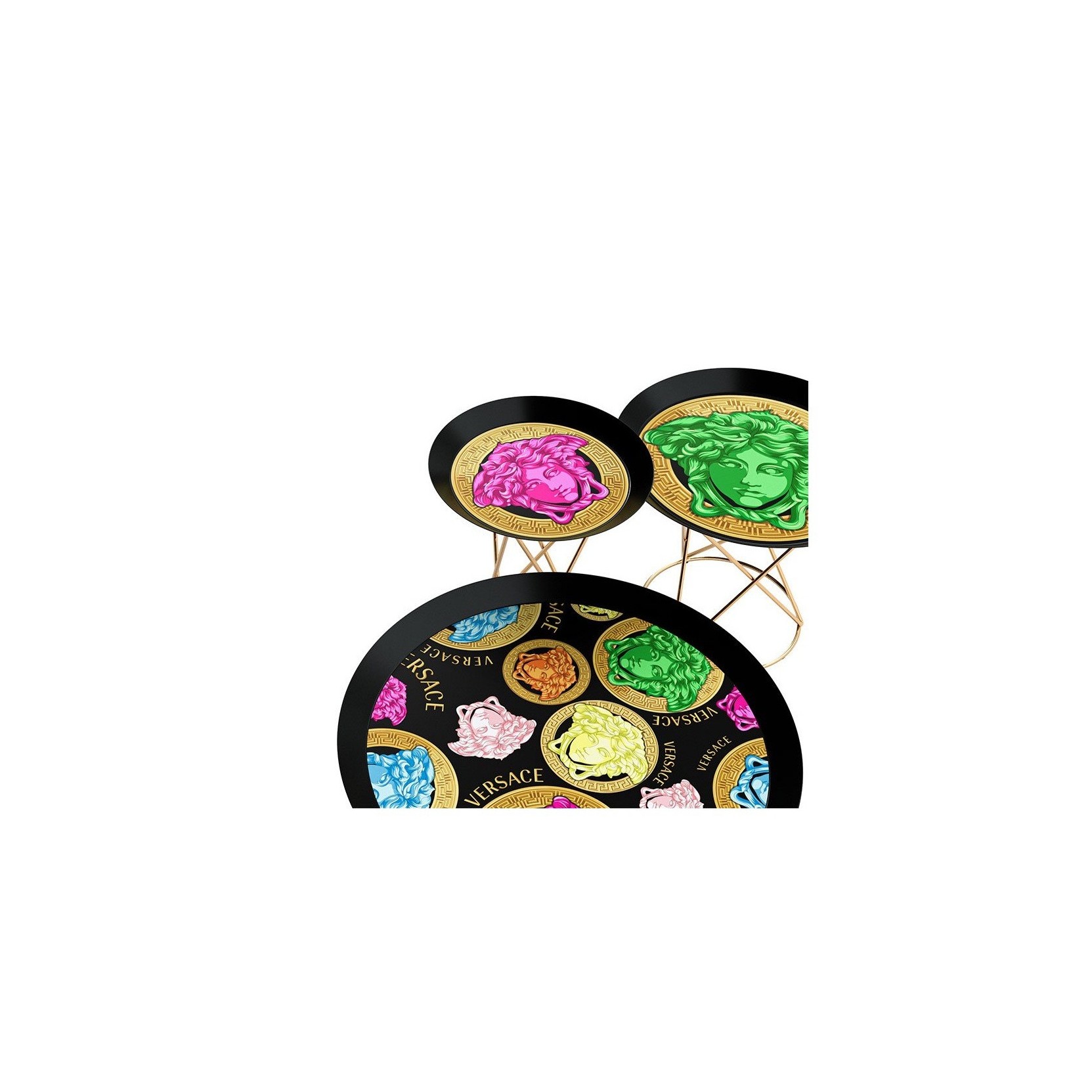 Il top-vassoio celebra il DNA del brand con la decorazione Medusa Amplified nelle tre varianti multicolor, green oppure pink. Un inno colorato e ribelle alla creatività Versace. Struttura in acciaio verniciato finitura Gold lucido.Spedizione 5-6 settimane lavorative