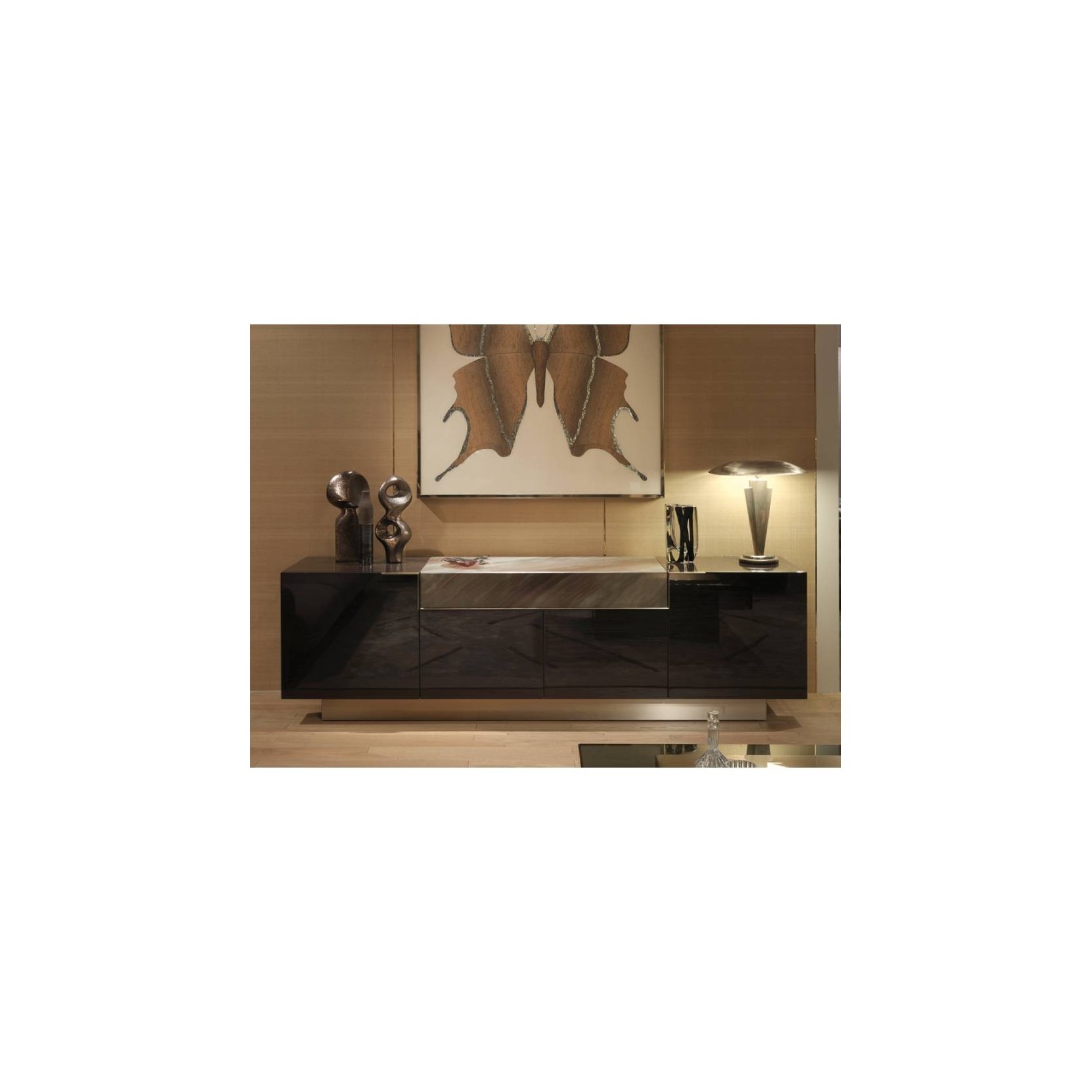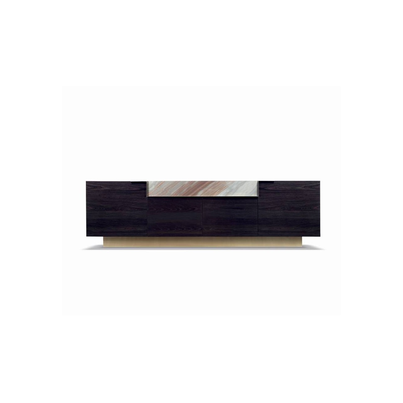 Bronson è un mobile basso in legno rivestito in essenza con fianchi sagomati e top centrale in marmo. Mostra quattro ante in essenza, un cassetto con frontale in marmo e maniglie in acciaio satinato.Spedizione 5-6 settimane lavorative
