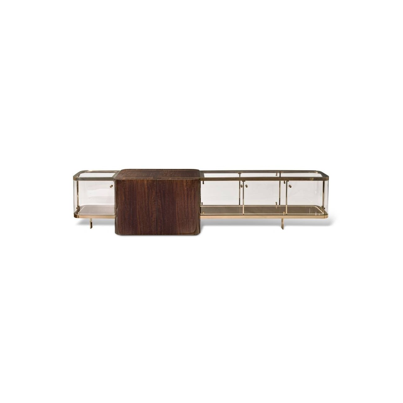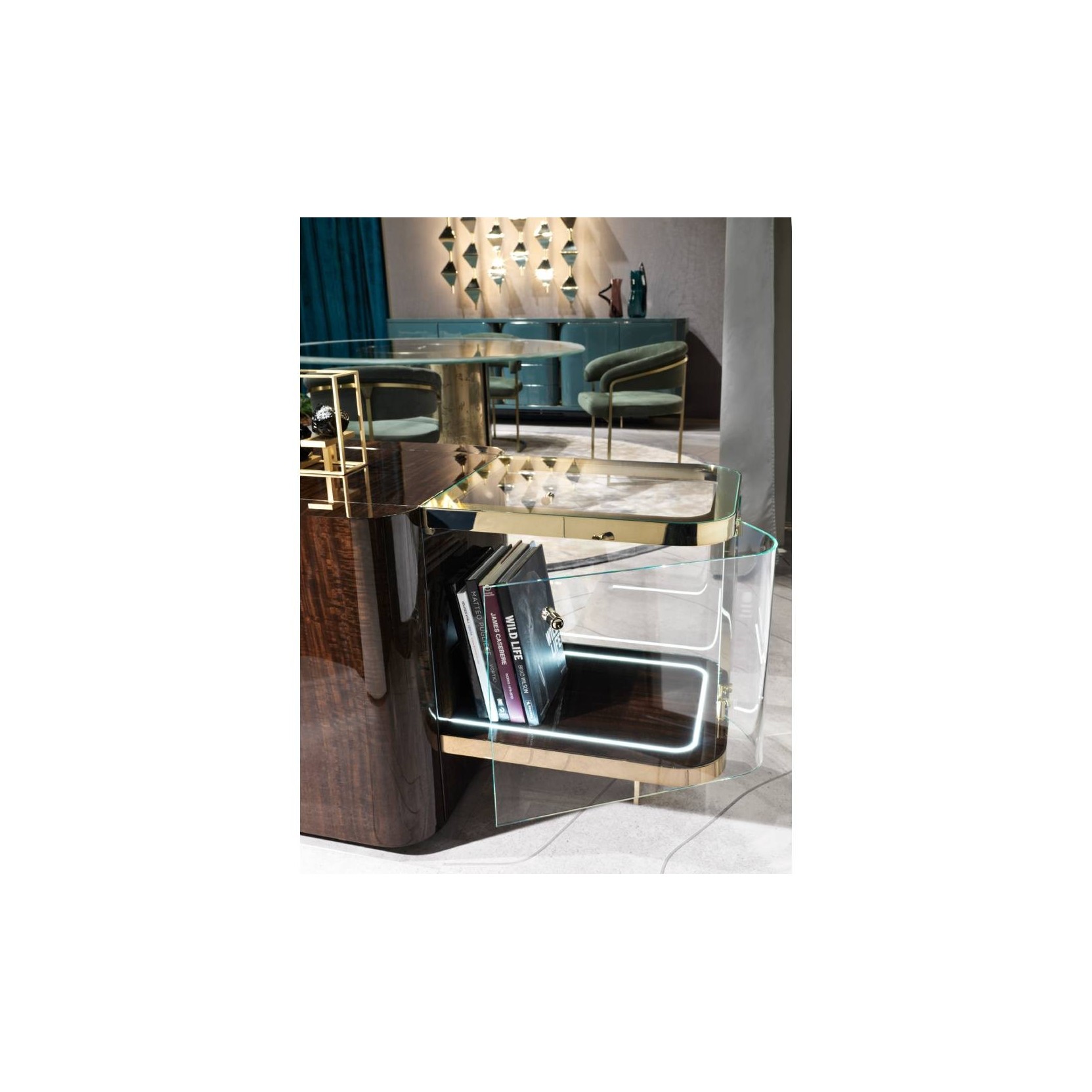 Desmond è una madia bifacciale con 4 ante curve in legno di eucalipto con finitura lucida 100 gloss. Laccato internamente con ripiano in vetro. Vetrine laterali con doppia apertura, piano e ante in vetro curvato extrachiaro. Profili in acciaio con finitura laccata oro lucido. Per enfatizzare la funzione "vetrina", un LED curvo corre lungo l'intera base per illuminare teatralmente gli oggetti contenuti. Le ante, sia in legno che in vetro, si aprono su tutti i lati permettendo l'accesso sia dalla parte anteriore che da quella posteriore.Spedizione 5-6 settimane lavorative